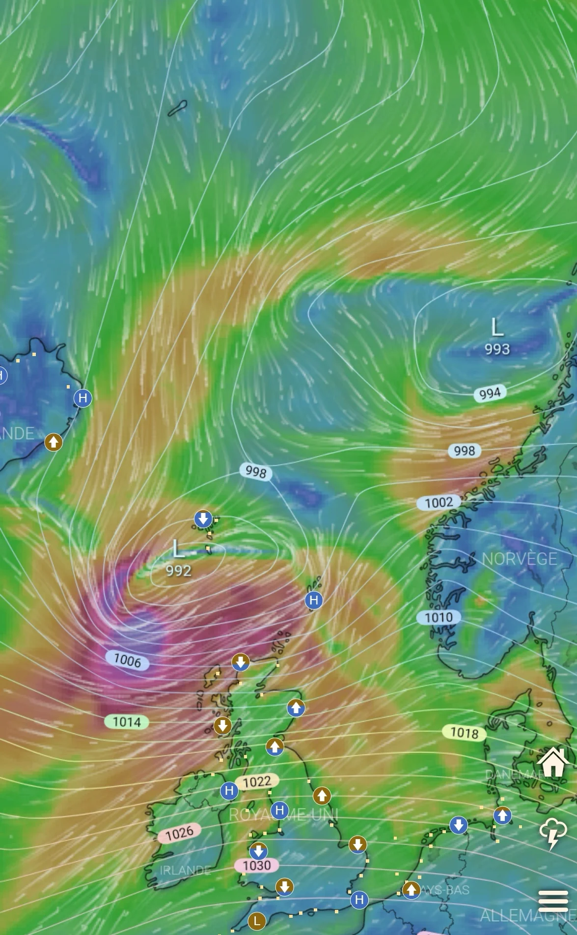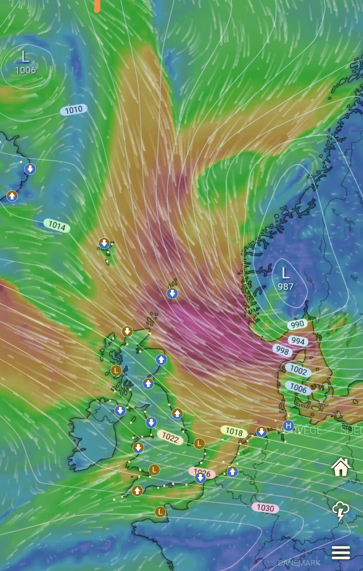 C’est de saison, une dépression s’est à nouveau créée au nord-ouest de l’Angleterre. Elle emprunte sa route habituelle vers la Norvège. Dans ce cas-ci, un peu avant cette dernière, une seconde zone de basse pression est née. Le fait qu’elle prend forme plus au nord de la Norvège oriente le vent vers le pays des fjords et plus tard, dans la semaine, vers le Danemark. Il faudra attendre la fin de vie de cette basse pression pour voir arriver des vagues clean.